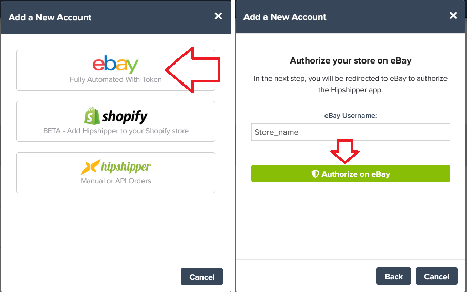 3. Click on the 'eBay' option (the top option), in the 'Authorize your store on eBay' page Insert the store's name and click the 'Authorize on eBay' button